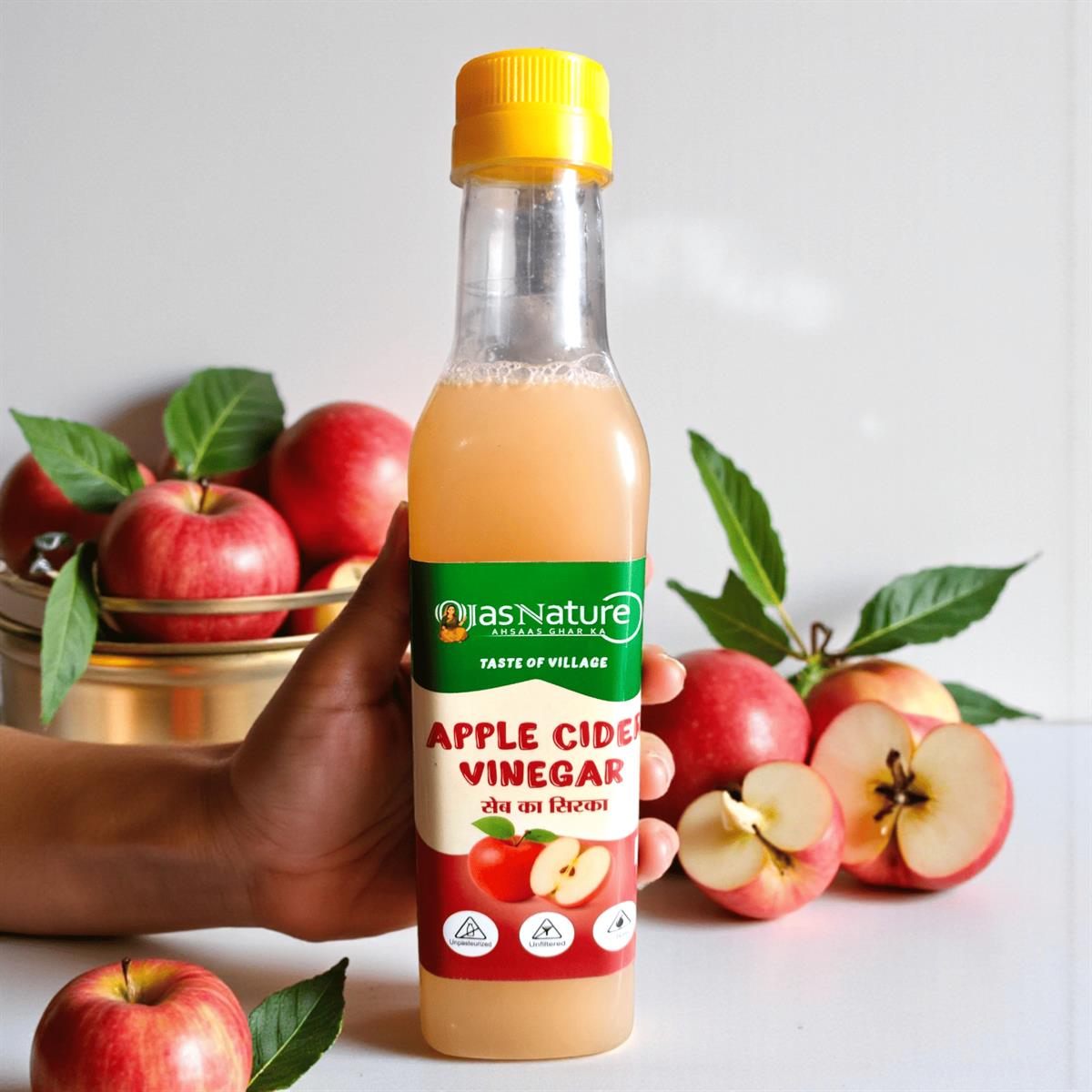 Ojas Nature’s Apple Cider Vinegar is carefully prepared from fresh apples through a slow and natural fermentation process. This method allows the vinegar to develop the ‘mother’ – strands of beneficial culture that give the product its distinct character. Our vinegar is handcrafted in small batches by village women, supporting local employment while ensuring authentic quality. It is preservative-free, unpasteurized, and free from unnecessary additives, making it a mindful addition to your kitchen and wellness routine.
